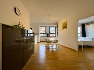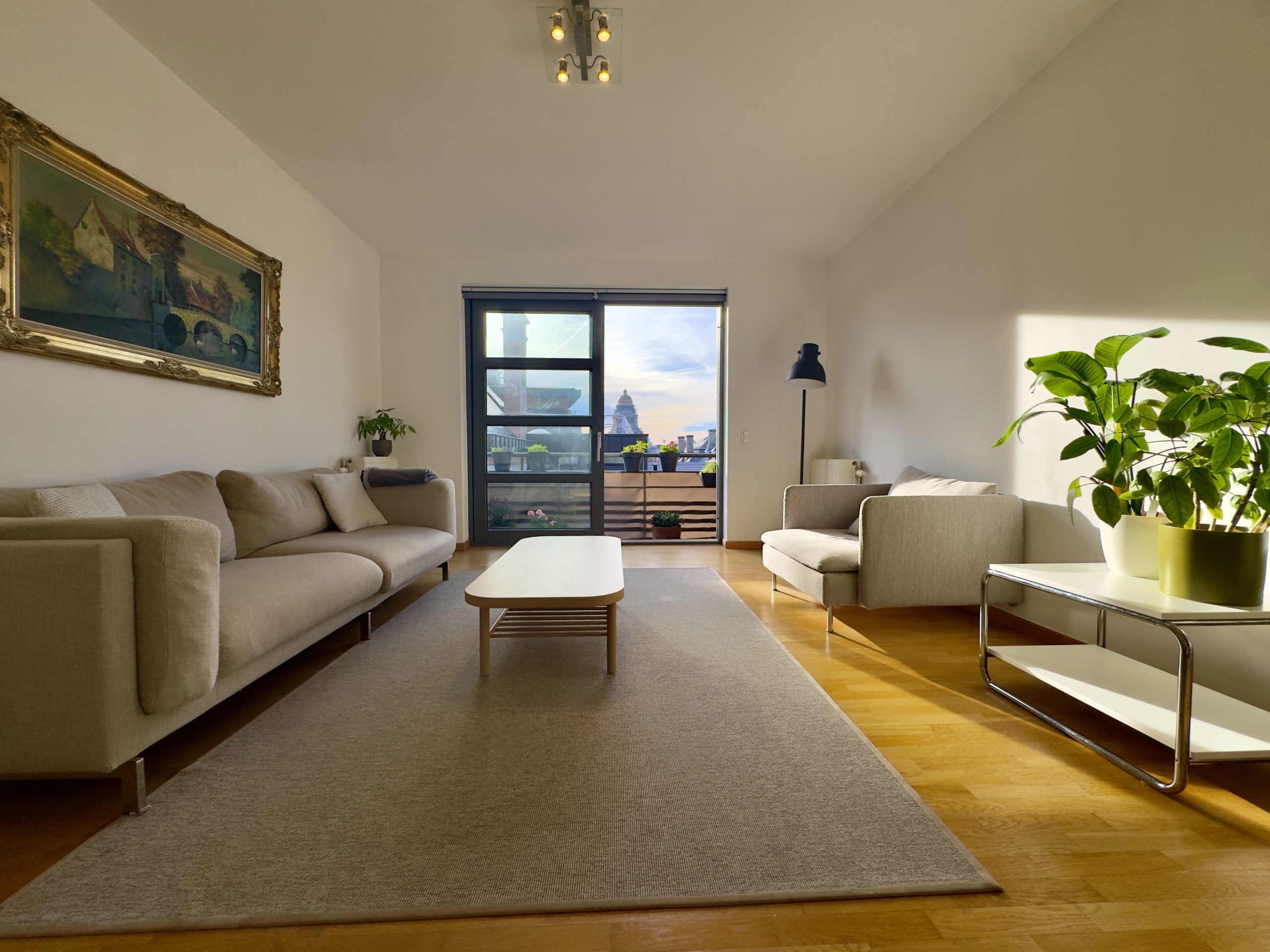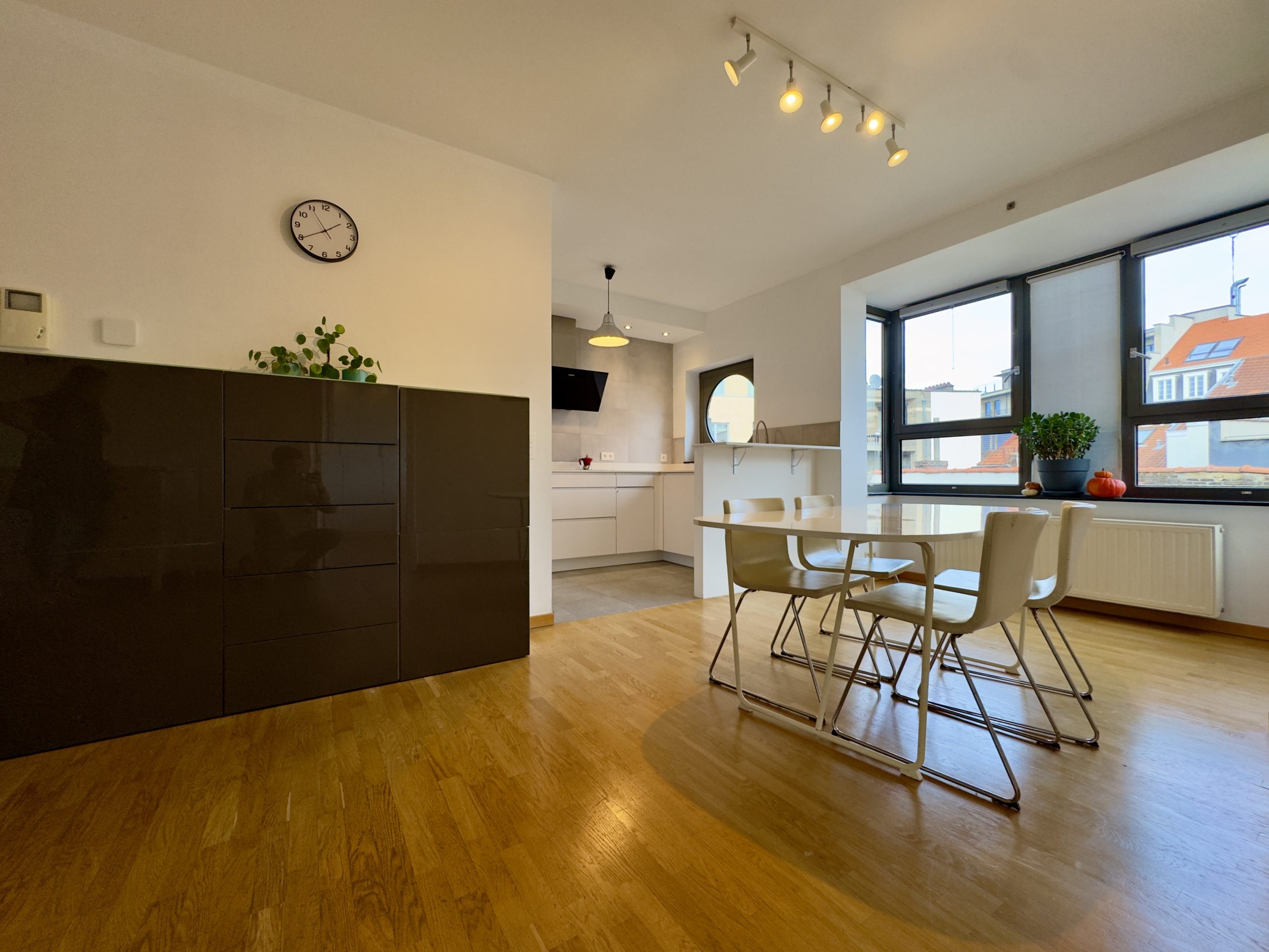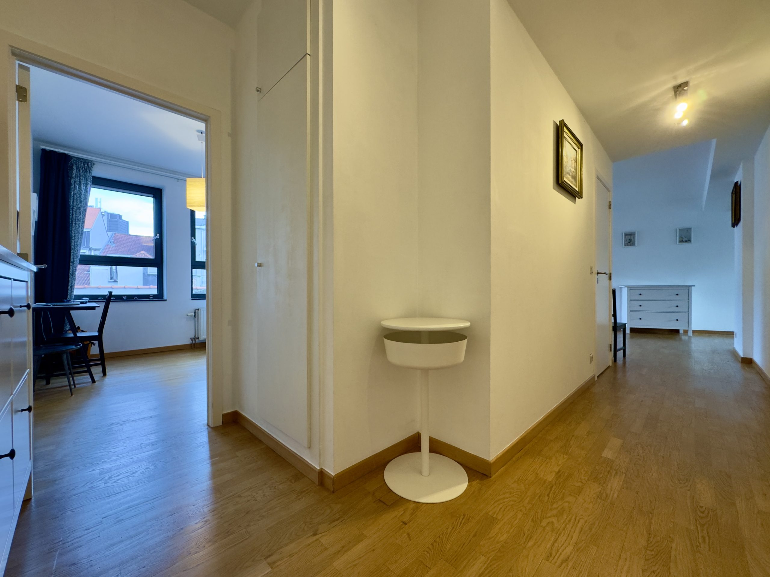 Situé en plein cœur de ville sur le prestigieux quartier du Sablon avec une vue imprenable sur le Palais de Justice, magnifique appartement meublé d'une superficie totale de ± 109 m² au 5ème étage d'un bel immeuble résidentiel de standing. Il se compose d’un hall d'entrée avec vestiaire et toilette indépendante, d’un spacieux living (± 25 m²), d'une salle à manger (± 15 m²) avec cuisine ouverte hyper équipée (rénovée en 2022), 1ère chambre (± 17 m²) avec sa salle de douche attenante et une buanderie équipée, d’une 2eme chambre (± 10 m²) avec sa salle de douche attenante et une toilette. Belle terrasse de ± 4 m² exposée Sud sans vis-à-vis. 1 cave incluse et 1 garage fermé (+200€/mois supplémentaires obligatoire). Charges : 350€/mois (provision pour l'entretien des communs, l'eau, le chauffage, l'électricité et internet). PEB : C+. Disponible à partir du 1er Janvier 2026. A découvrir au plus vite avec Pons Realty !!